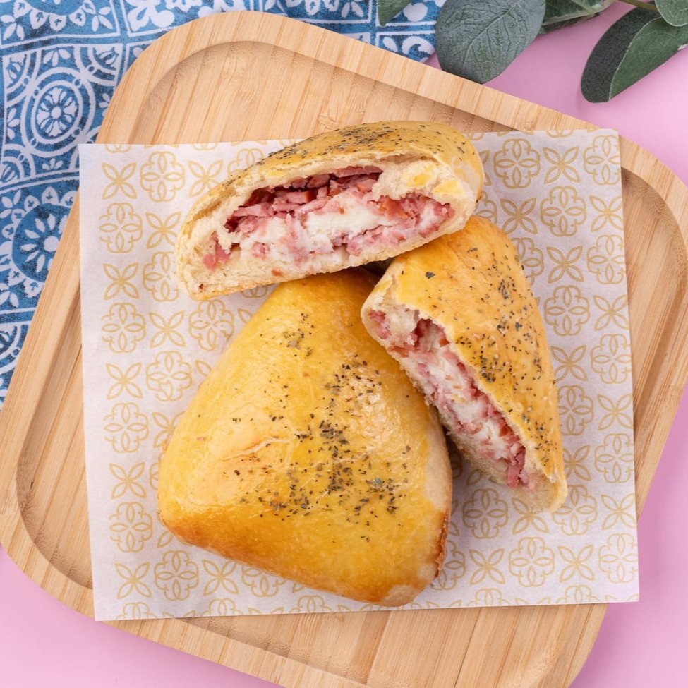 Delicioso salgado assado, recheado com queijo e presunto. Aproximadamente 100g