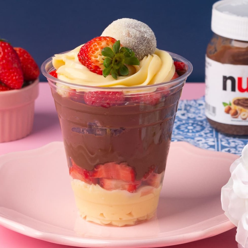 Pedaços de Brownie, 2 camadas de brigadeiro de leite Ninho, 2 camadas de Nutella e morangos frescos.
