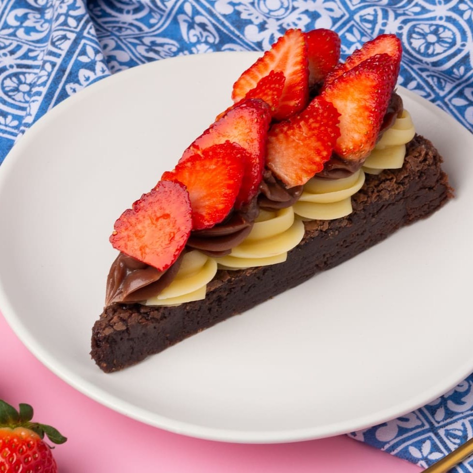 Deliciosa fatia de Brownie com uma camada de Nutella Original Pura e fatias de Morangos Frescos.
