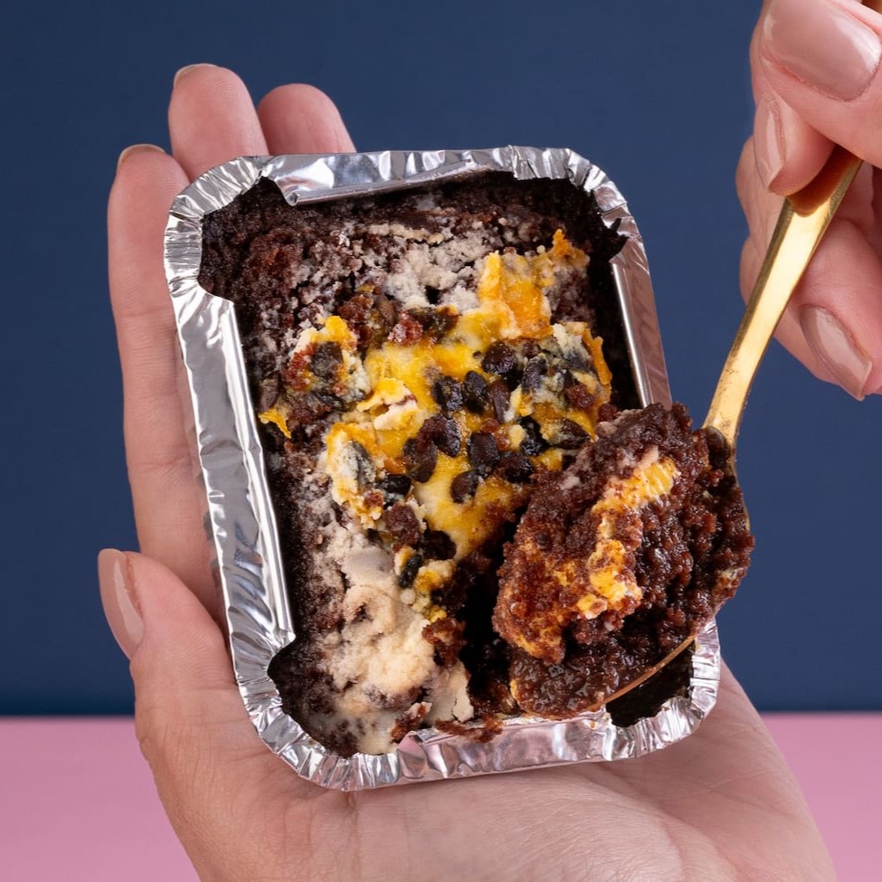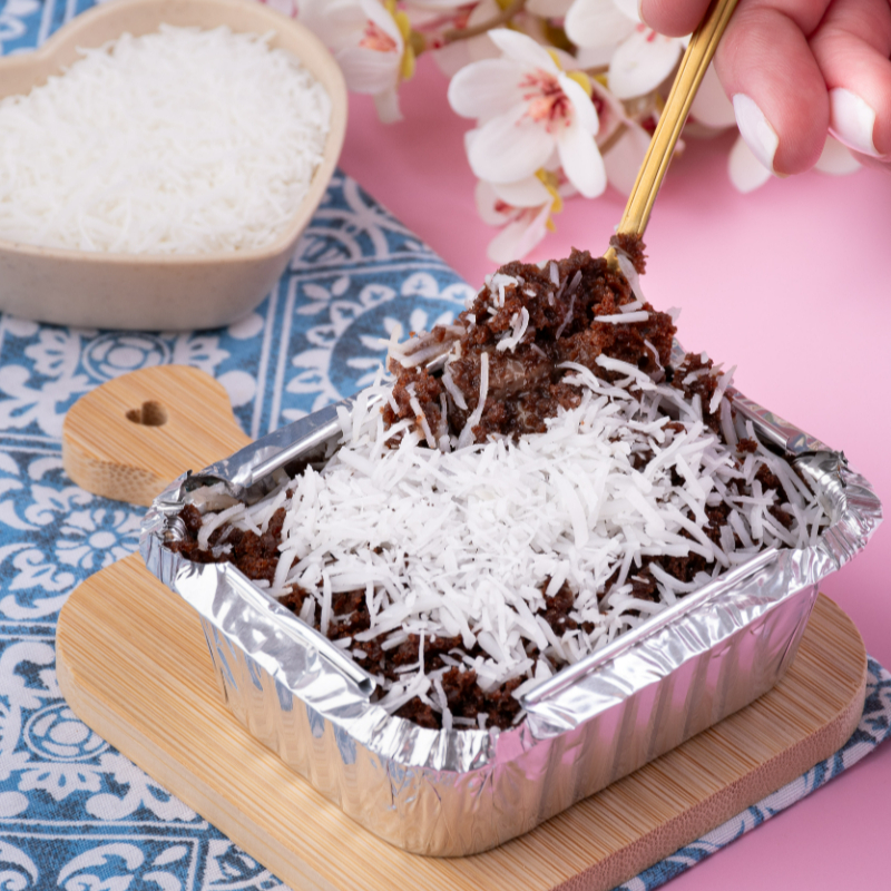 Deliciosa massa de chocolate com recheio de coco e brigadeiro. Porção pequena Capacidade da marmitinha: 135ml Peso final aproximado: 140g