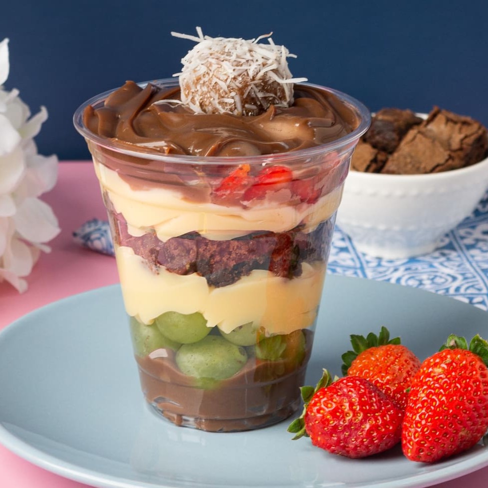 Farofa de biscoito, brigadeiro de leite Ninho, uva fresca selecionada, chantilly e suspiros. Nossas sobremesas são preparadas na hora, bem fresquinhas especialmente para você. Recomendamos o consumo imediato.