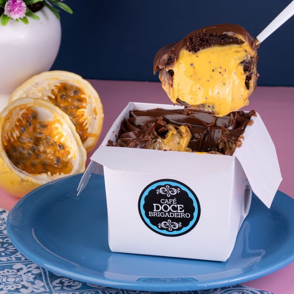 Nosso novo brigadeiro de maracujá com ganache de chocolate blend. Irresistível. Peso final aproximado: 120g Porção pequena, servida em embalagem de 120ml.