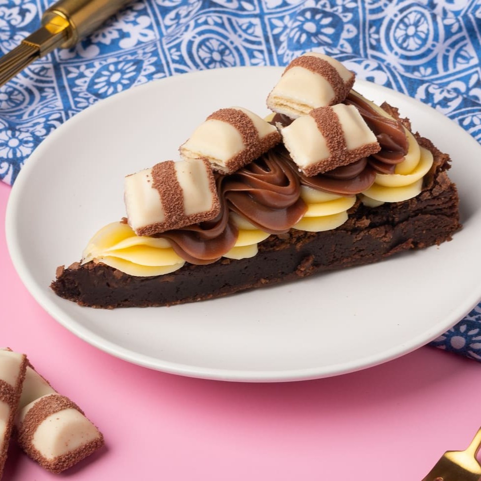 Deliciosa fatia de brownie com 2 camadas de brigadeiro e Kinder Bueno White 19.5g