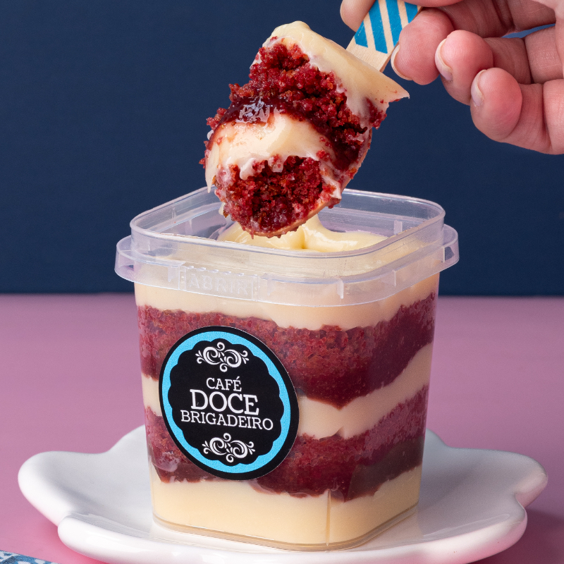 Camadas do nosso red velvet fofinho com brigadeiro de leite Ninho super cremoso e a nossa calda artesanal de morango, feita com fruta de verdade. Uma combinação delicada, equilibrada e apaixonante em cada colherada. 220ml.