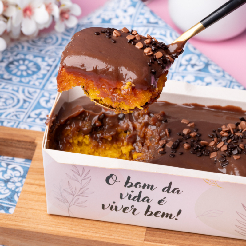 A combinação desses dois elementos é uma verdadeira sinfonia de sabores. Bolo e cobertura são enviados quentinhos, prontos para servir. Obs: a cobertura e o complemento (escolha a seguir) serão enviados a parte para uma melhor experiência. Peso final aproximado: 1,3 kg bolo aproximadamente 800g brigadeiro aproximadamente 500g Complemento aproximadamente 25g