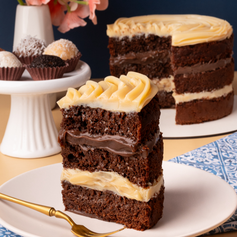 Bolo gelado irresistível, preparado com três camadas de bolo de chocolate macio e intenso, intercaladas com duas camadas de brigadeiro de leite Ninho cremoso e uma camada de brigadeiro de chocolate, criando o equilíbrio perfeito entre sabor marcante e cremosidade. Produto para consumo imediato. Peso aproximado: 1,7 kg Rendimento: até 14 fatias de aproximadamente 120g