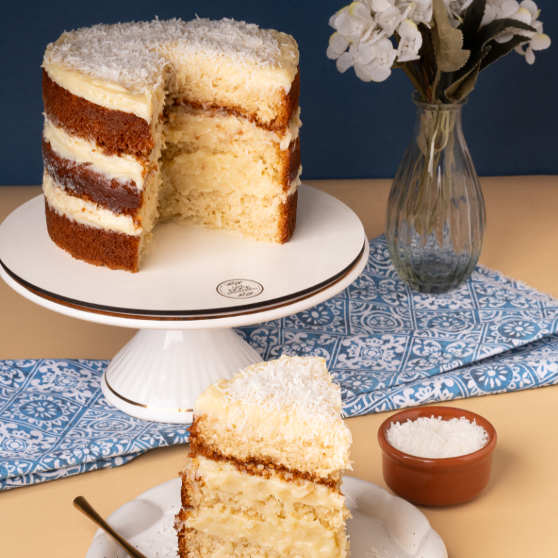 Bolo gelado composto por três camadas de massa branca extremamente macia e bem molhadinha, intercaladas com três camadas generosas do nosso brigadeiro de coco cremoso. Finalizado com flocos de coco, trazendo ainda mais sabor e textura. Produto para consumo imediato. Peso aproximado: 1,7 kg Rendimento: até 14 fatias de aproximadamente 120g