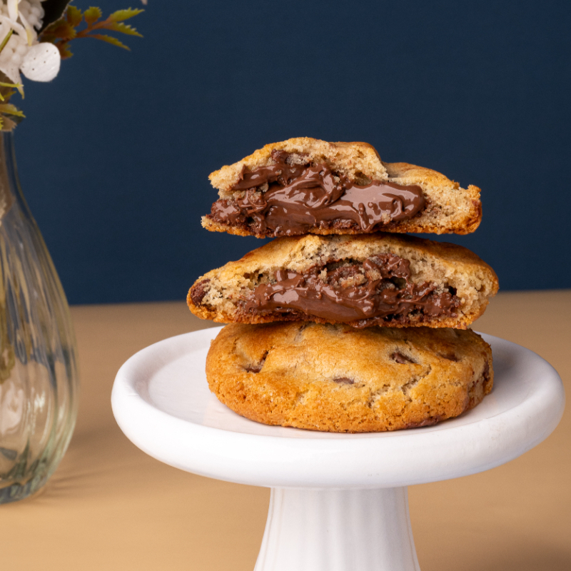 Cookie artesanal com massa macia e saborosa, com gotas de chocolate nobre e recheado com Nutella Original, criando uma combinação intensa, cremosa e irresistível. Produto para consumo imediato. Peso aproximado: 80g.