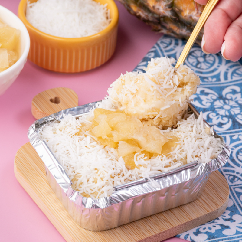 O nosso bolo gelado mais pedido, agora na versão coco com abacaxi. Porção pequena Capacidade da marmitinha: 135ml Peso final aproximado: 140g