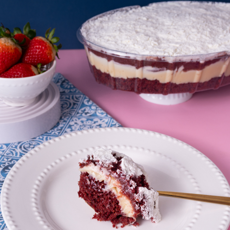 Red velvet fofinho e úmido, com camadas generosas de brigadeiro de leite Ninho®️ super cremoso e finalização com a nossa calda artesanal de morango. Uma sobremesa elegante, geladinha e perfeita para compartilhar.