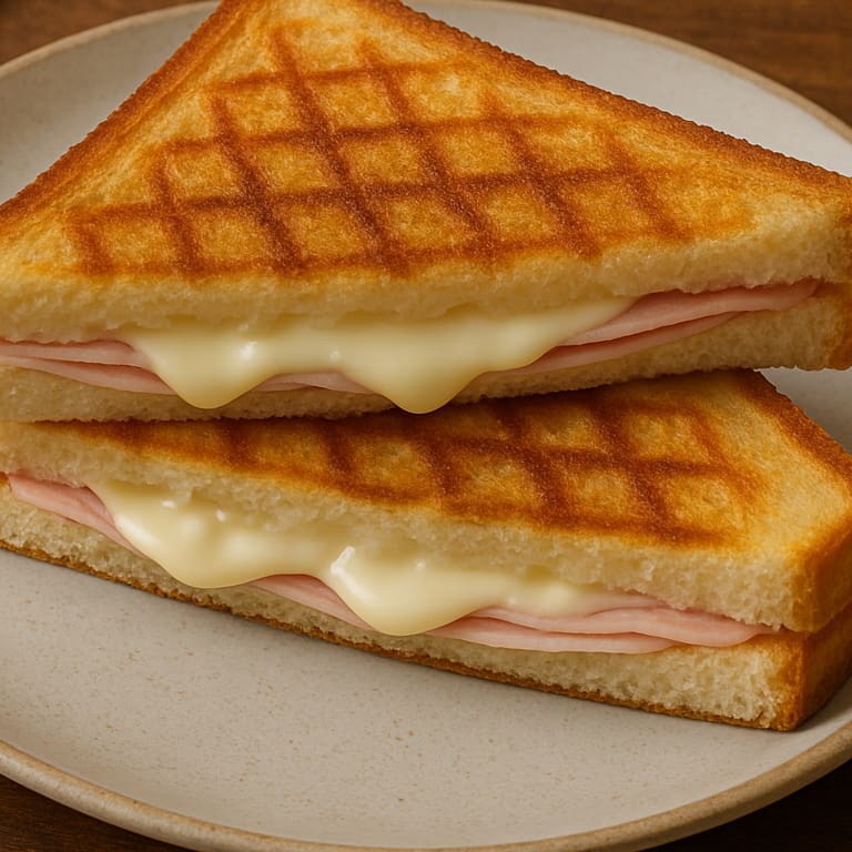 Delicioso tostex feito no pao de forma macio , com 2 fatias de presunto e 2 fatias de queijo.
