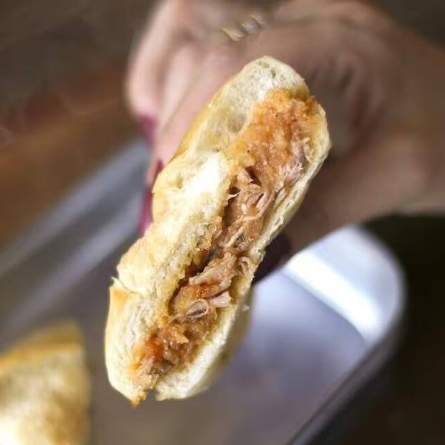 Pão de sal (francês) selado na chapa, com um toque extra de crocância, recheado com pernil desfiado e temperado com especiarias da casa com ou sem queijo canastra derretido!