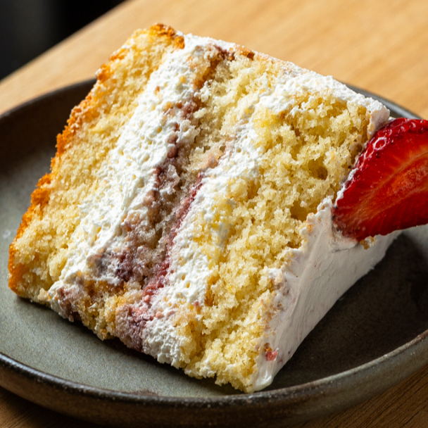 Massa fofinha de baunilha, com recheio de quatro leites e geleia de morango.