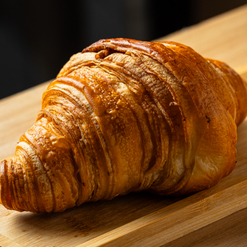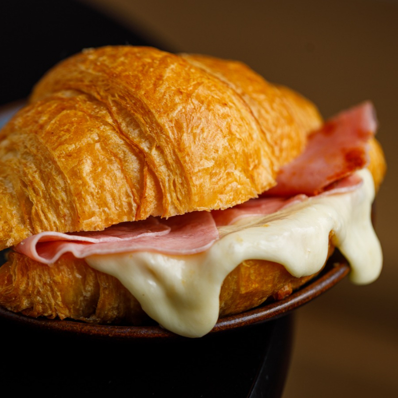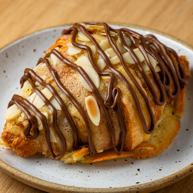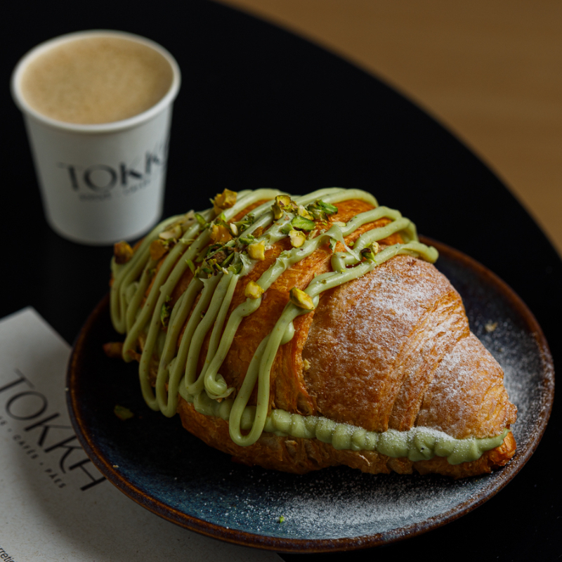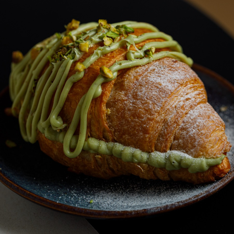 Croissant amanteigado, crocante por fora e macio por dentro, recheado com creme de pistache, acompanhado de cappuccino cremoso.
