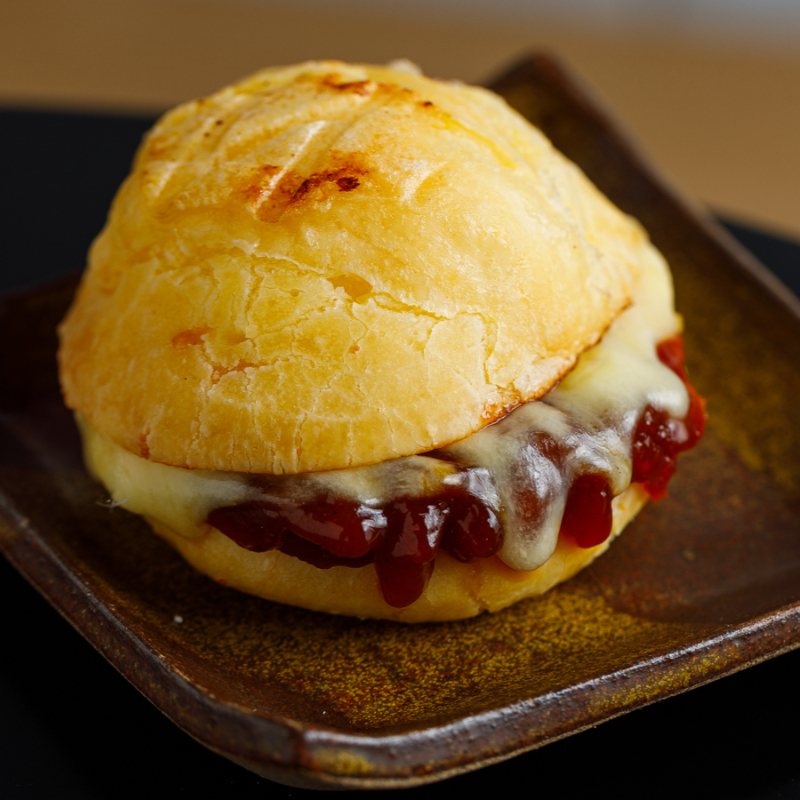 Pão de queijo quentinho com queijo derretido e toque de goiabada.