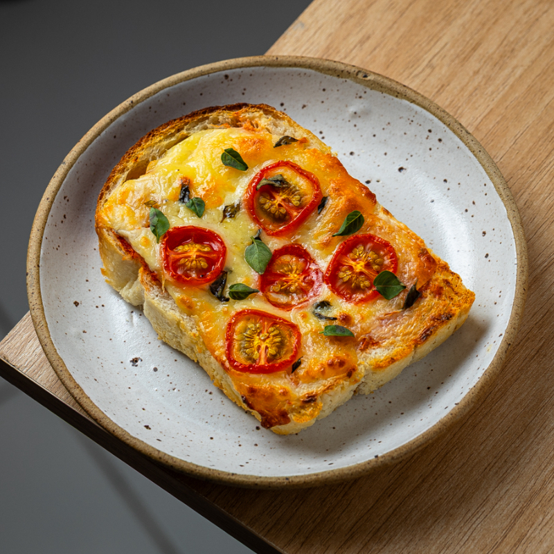 Toast com cobertura de queijo, manjericão e tomatinhos.