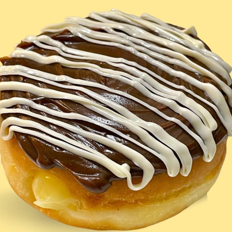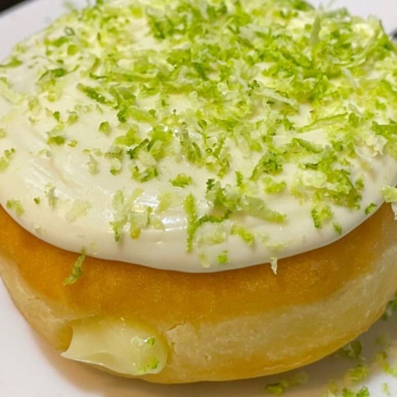 Donut recheado com creme bavarian, cobertura de chocolate branco com raspas de limão.