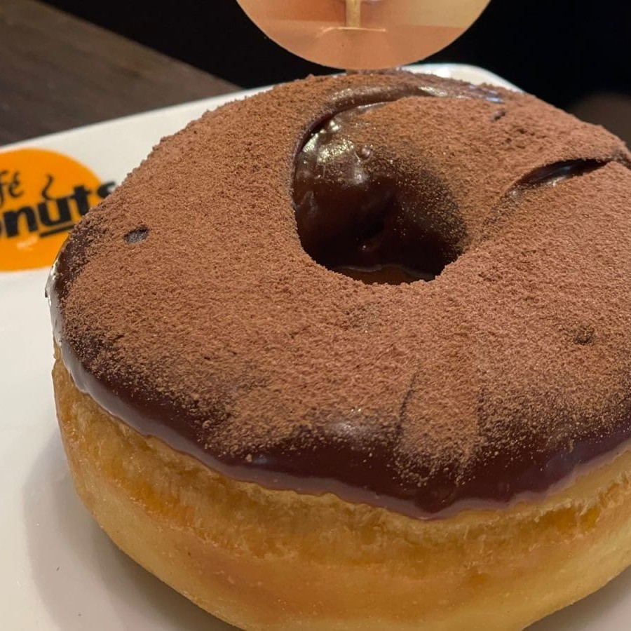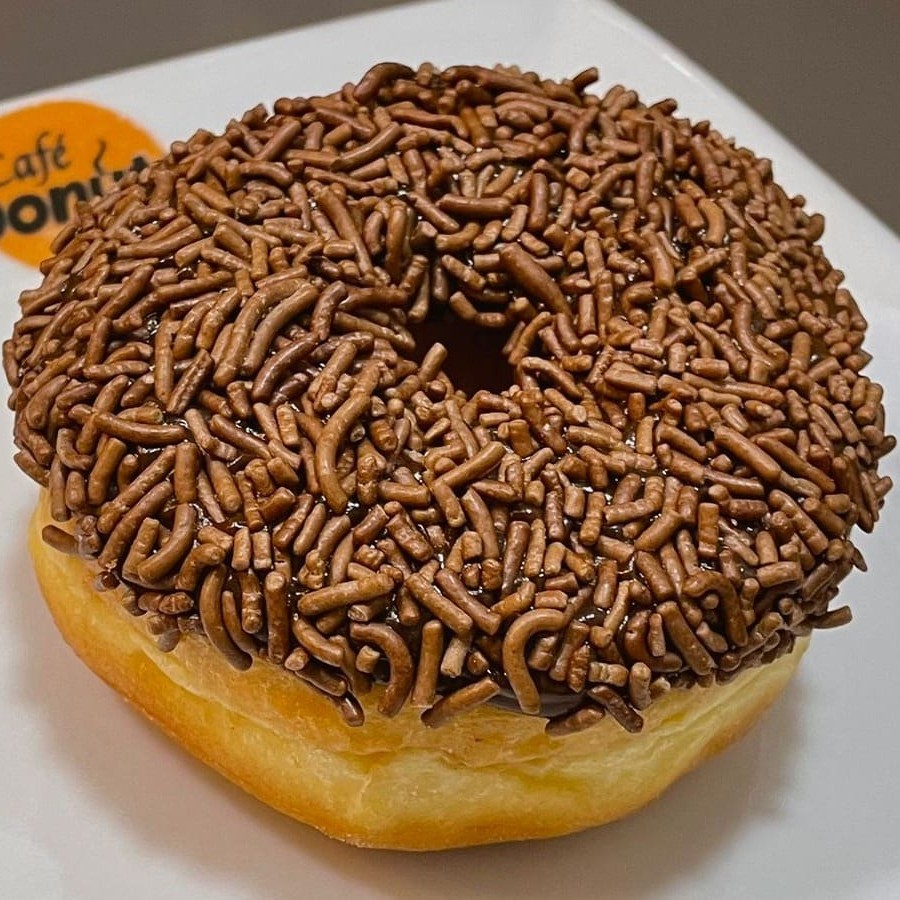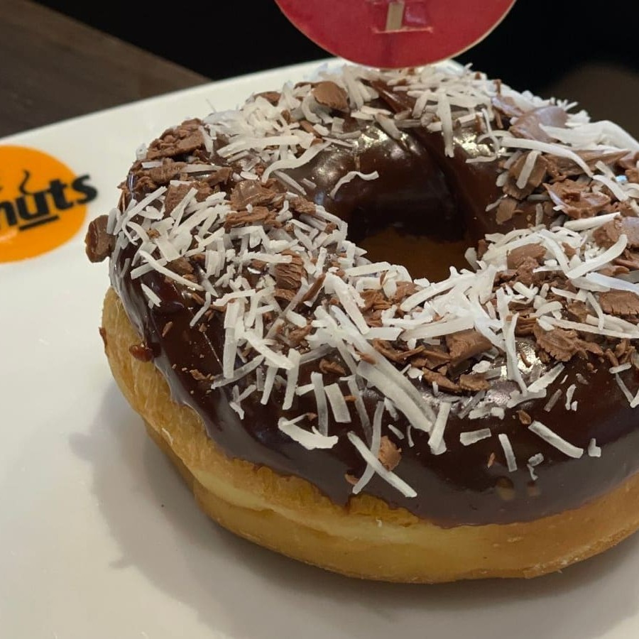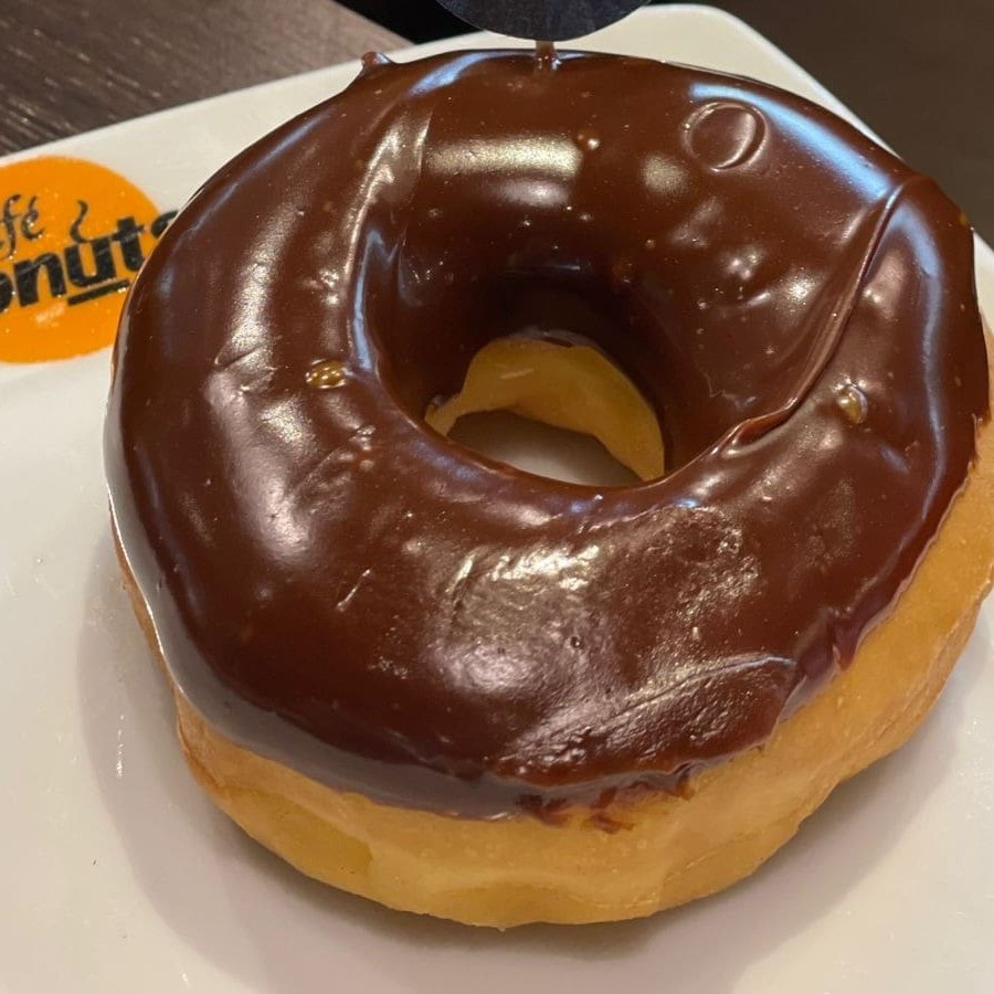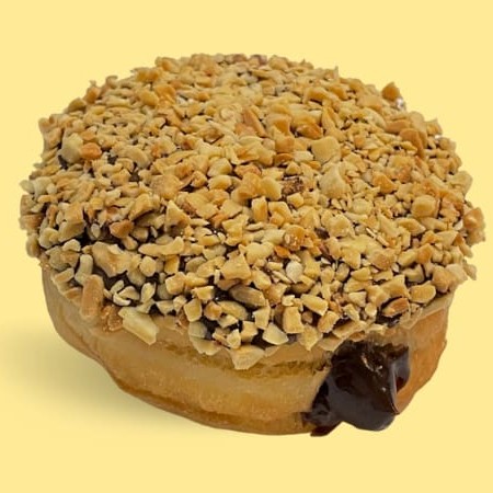 Donut tradicional recheado de creme bavarian e cobertura de caquinha chocolate crocante.