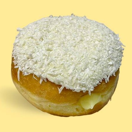 Donut recheado com creme bavarian com cobertura de chocolate branco confeitado com coco ralado.
