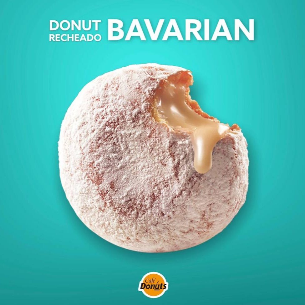Donut recheado com creme bavarian, cobertura de chocolate ao leite confeitado com pedaços crocantes de Negresco.