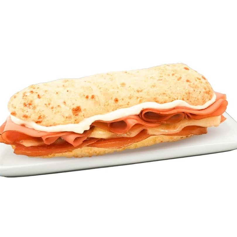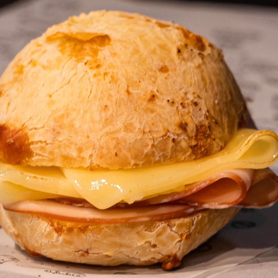Um clássico com um toque especial: biscoito de pão de queijo crocante por fora e macio por dentro, recheado com mortadela defumada, mussarela derretida e a cremosa maionese grill Cb.