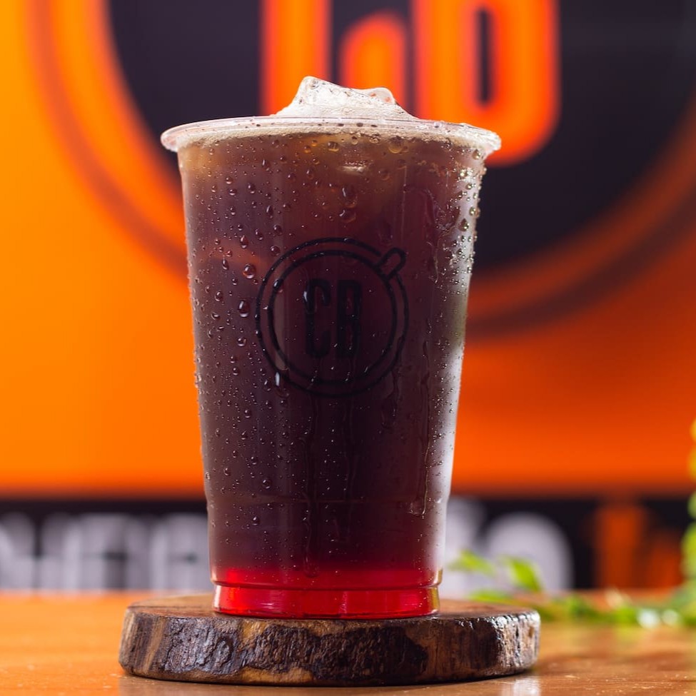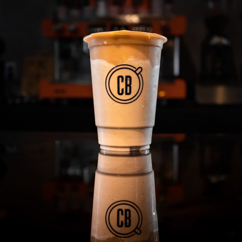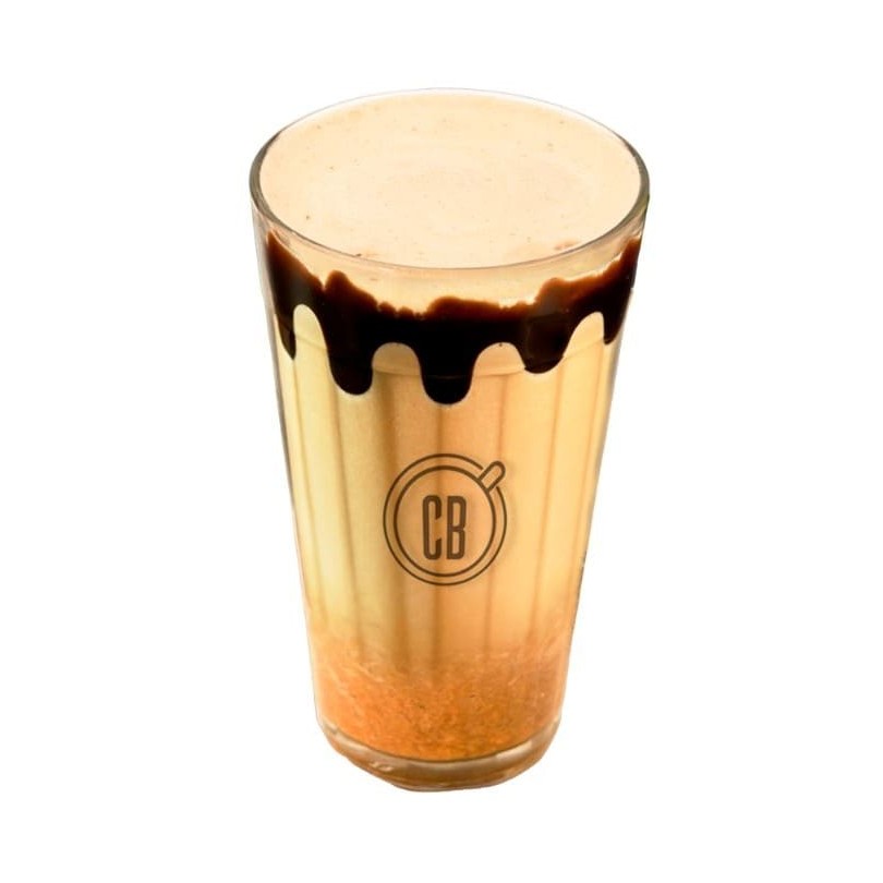 Cappuccino Cb gelado e cremoso com borda de doce de leite de café. Bebida gelada. Excelente opção para o calor.