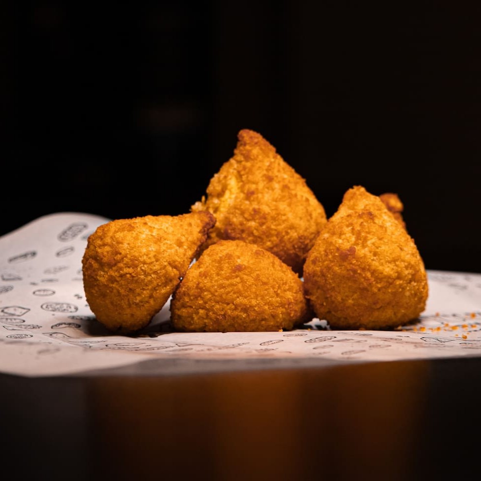 Porção com 5 unidades de suculentas coxinhas assadas com recheio de frango com requeijão