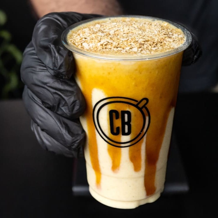 Delicioso Frapê de Banana com leite de aveia, fruta, calda de caramelo e blend de cereais. Um geladíssimo que resolve sua fome e é super nutritivo. Ideal para se refrescar e ainda ser uma fonte de energia para seu pré ou pós treino.