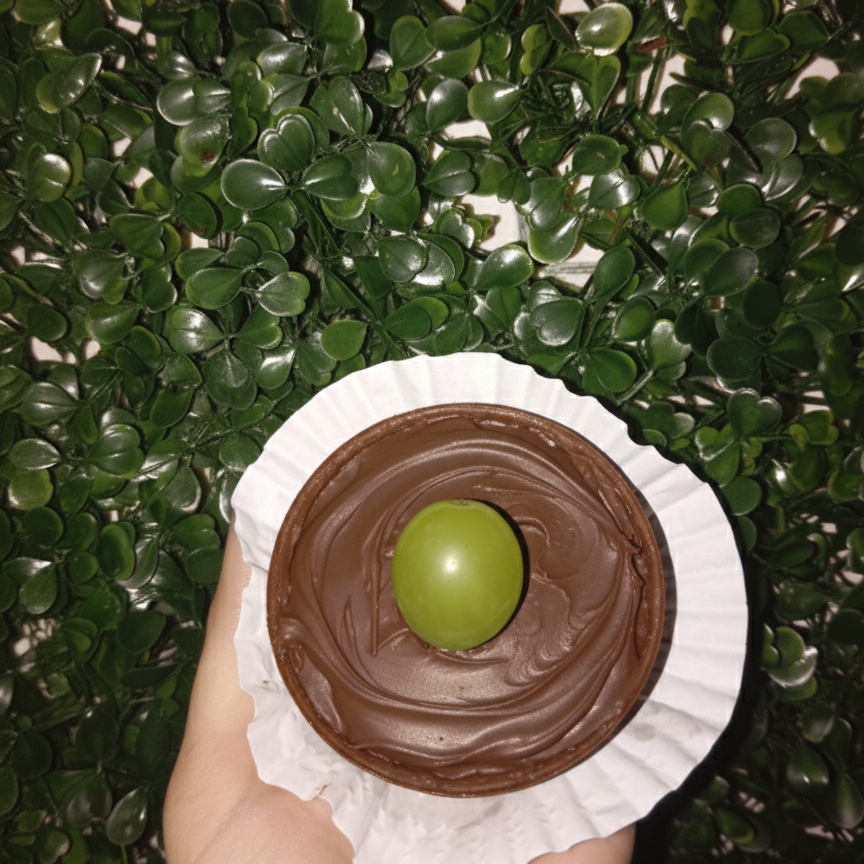 Bombom feito com chocolate ao leite, recheio de ninho com uvas verdes