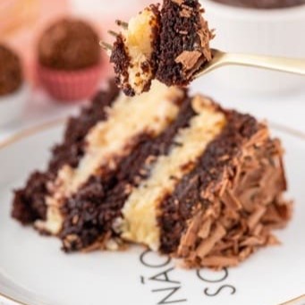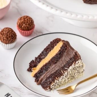 Bolo de chocolate recheado com brigadeiro ao leite (tradicional) e brigadeiro branco, coberto com brigadeiro ao leite. Validade 4 dias contado da fabricação (vide embalagem). Peso aproximado 150g.