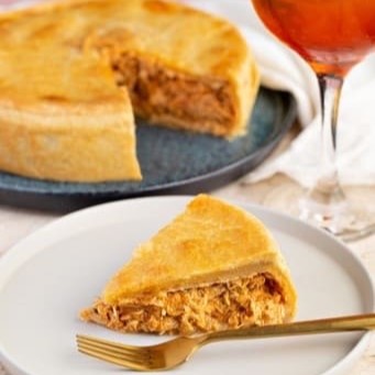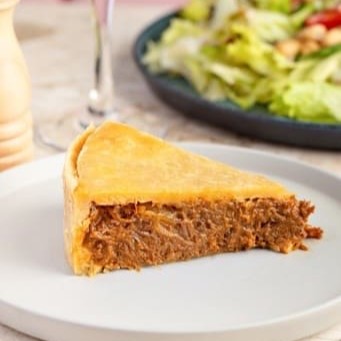 Nossa deliciosa torta de carne na cerveja com cebola caramelizada , com nossa massa amanteigada. item não acompanha salada! foto ilustrativa