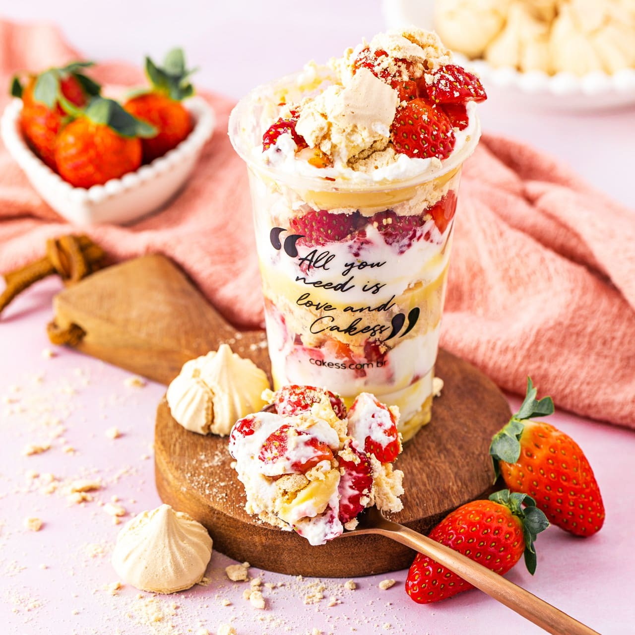Sobremesa tradicional com suspiros, chantilly fresco, morango e brigadeiro- pote de 330ml