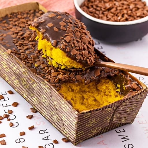 Bolo caseirinho de cenoura coberto com brigadeiro ao leite feito na forma de bolo inglês. Rend. Médio 3 porções.