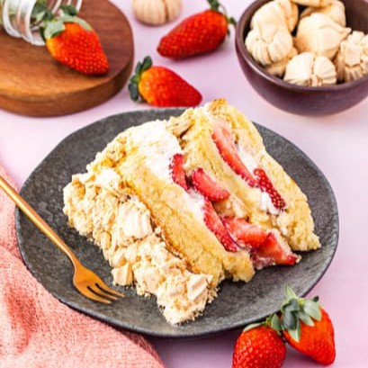 Bolo de baunilha recheado com brigadeiro branco, suspiros da casa, morangos coberto com chantilly fresco e suspiros [produto sensível ao transporte]. Validade: Consumo Imediato (vide embalagem). Peso aproximado 150g.