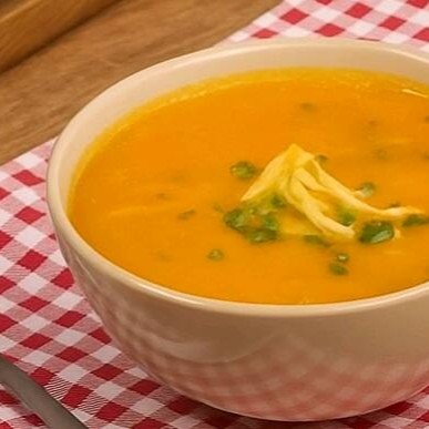 Caldo de abóbora cremoso com frango desfiado, temperado de forma especial e cheio de sabor caseiro. Uma combinação leve, nutritiva e deliciosa para aquecer seu Dia