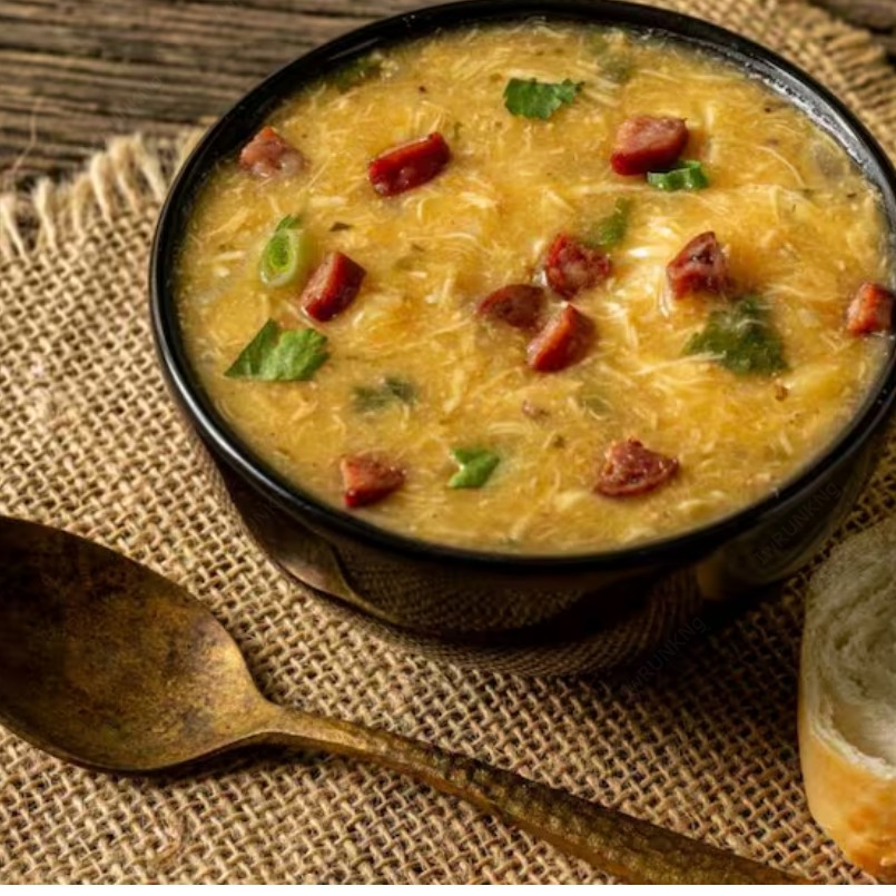 Uma combinação irresistível de mandioca, mandioquinha, cenoura, calabresa, bacon e frango desfiado, tudo cozido lentamente com temperos frescos. Cremoso, encorpado e cheio de sabor caseiro — perfeito pra matar a fome e aquecer o coração!