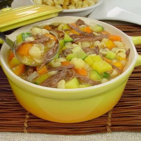Sopa de carne desfiada com legumes. Tudi fresquinho e saboroso