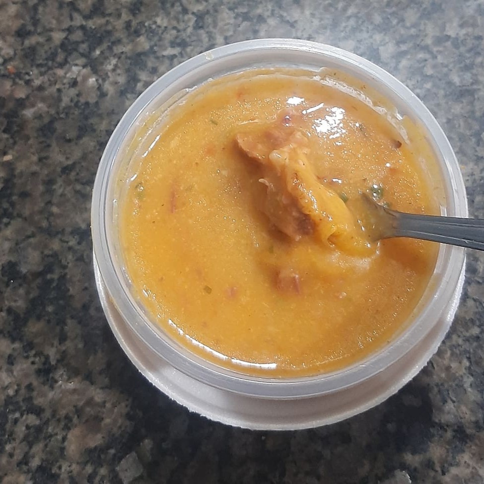 Delicioso Caldo de Abóbora, Bacon e Calabresa, servido em uma porção generosa de 290g. Este prato, pertencente à categoria de caldos, é aconchegante e repleto de sabores ricos e profundos. O bacon e a calabresa adicionam uma nota defumada e picante, enquanto a abóbora traz uma doçura natural e torna a textura irresistivelmente cremosa. Acompanha um refrescante Suco Natural, servido em uma prática