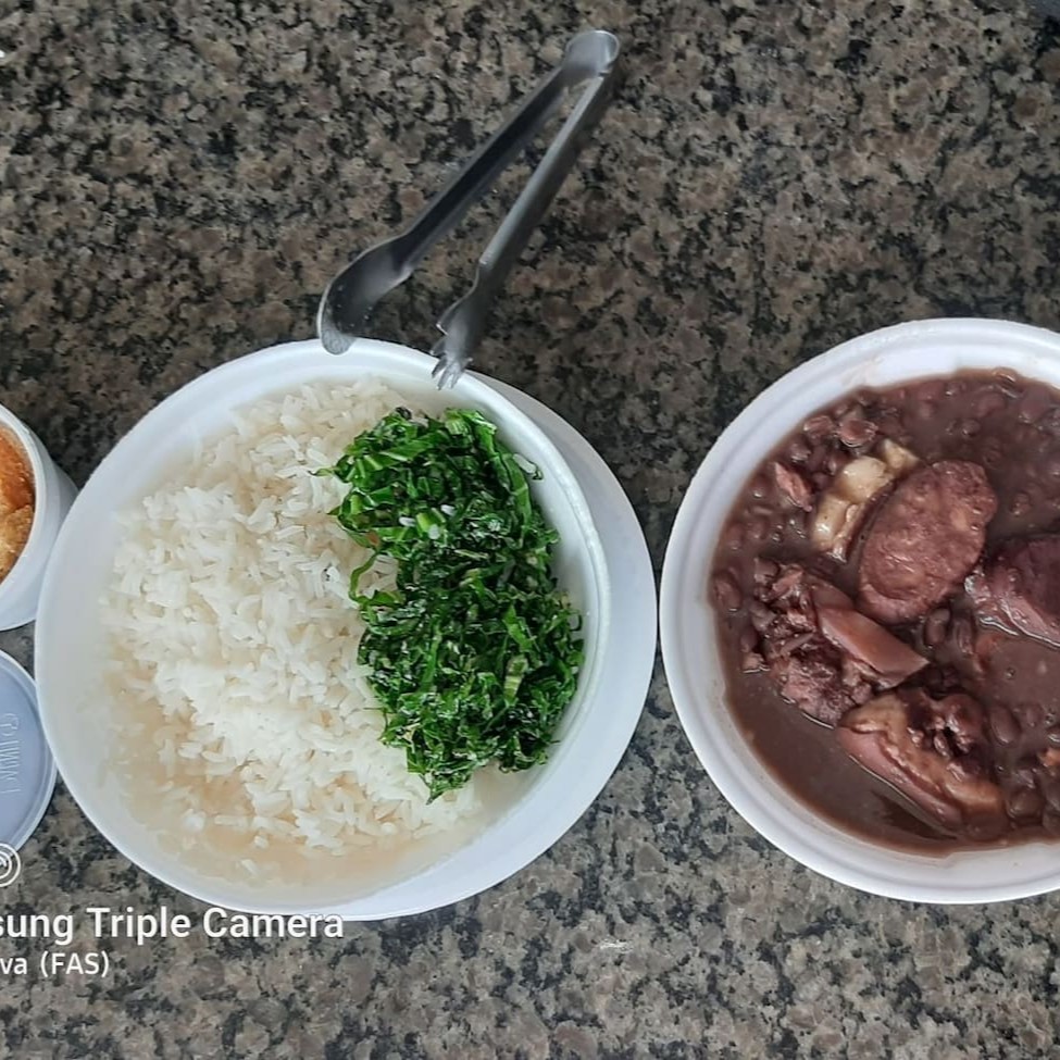 A 'Feijoada Delícia Completa' é uma experiência gastronômica única e irresistível. O prato inclui duas generosas marmitas grandes. A primeira, repleta de arroz branco soltinho e couve fresca, trazendo um sabor verde para equilibrar a refeição. A segunda marmita revela a estrela do prato, uma feijoada robusta e saborosa, cozida lentamente para realçar todos os sabores. Como acompanhamento, temos a