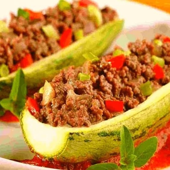 Abobrinha Recheada com carne moída bovina e arroz branco e purê de batata (P. F.) - salada Pedir Em Complementos