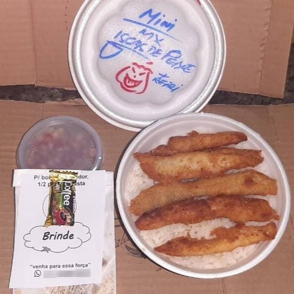 (Mini) Marmitex c/Iscas de Peixe Frito + Legumes a vapor, Arroz e Feijão + Refri 200ml (Fanta, Coca, Guaraná) / (Fanta, Coca, Guaraná) / (laranja, uva, maracujá)