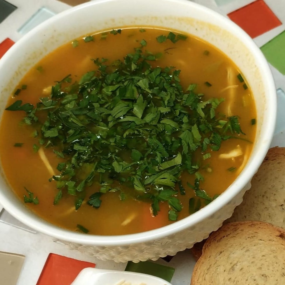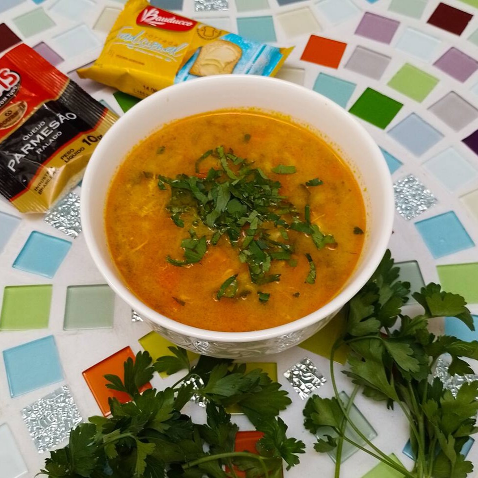 Sopa nutritiva com muitos legumes( batata, cenoura, mandioquinha, chuchu, vagem, abobrinha, cebolinha, abóbora cabotiá, salsão e salsinha) e frango desfiado. Com o delicioso tempero da chefe: contém cominho, coentro em pó, páprica doce, açafrão entre outras especiarias. #perfeita para substituir o jantar com muitos nutrientes e poucas calorias. Servido em uma generosa porção de 400 ml, este prato