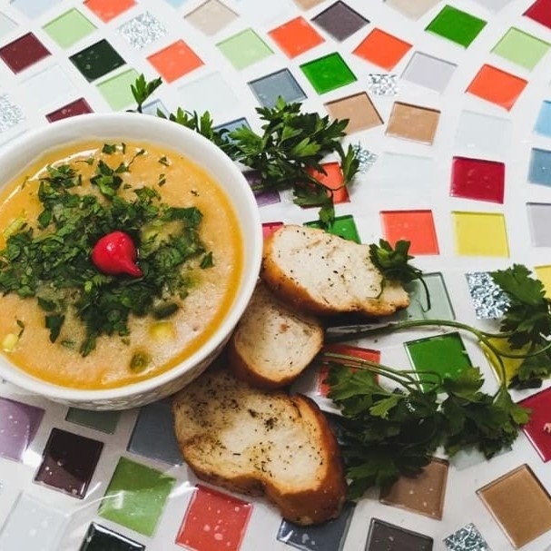 Exalando um aroma encantador, o '51-Creme de Abóbora com Frango' é uma obra-prima culinária da categoria 'Caldos, Sopas & Cremes'. Este creme deliciosamente aveludado de abóbora é enriquecido com suculento frango desfiado, finamente temperado com alecrim fresco, alho e cebola, um toque exótico de canela, a profundidade de noz-moscada e uma pitada de pimenta caiena para uma ligeira ardência. Cada c