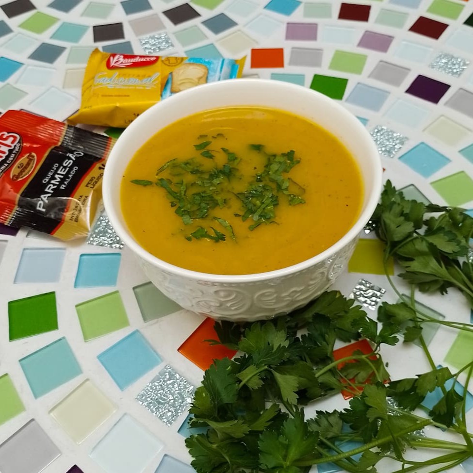 Feito com mandioquinha, ou batata baroa, como é conhecido na Minas Gerais. Com carne de costela desfiada ao estilo da famosa carne louca. E para temperar esse creme delicioso usamos curry, páprica doce, cominho, coentro em pó, louro e salsinha fresca. Servido em uma generosa porção de 400 ml, este prato é uma verdadeira explosão de gostosura. Não é possível retirar temperos ou ingredientes.