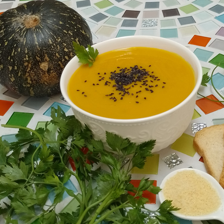 Delicioso creme de abóbora com gengibre e leite de coco, salpicado com gergelim preto. Prato super leve ajuda o organismo a se preparar para o sono. Não retiramos temperos ou ingredientes. 400ml