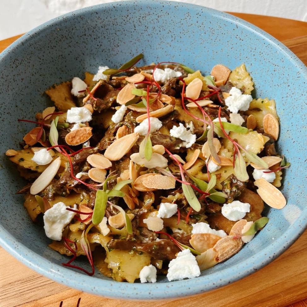 Farfalle salteado em molho pesto com mix de cogumelos, finalizado com queijo de cabra e amêndoas laminadas.