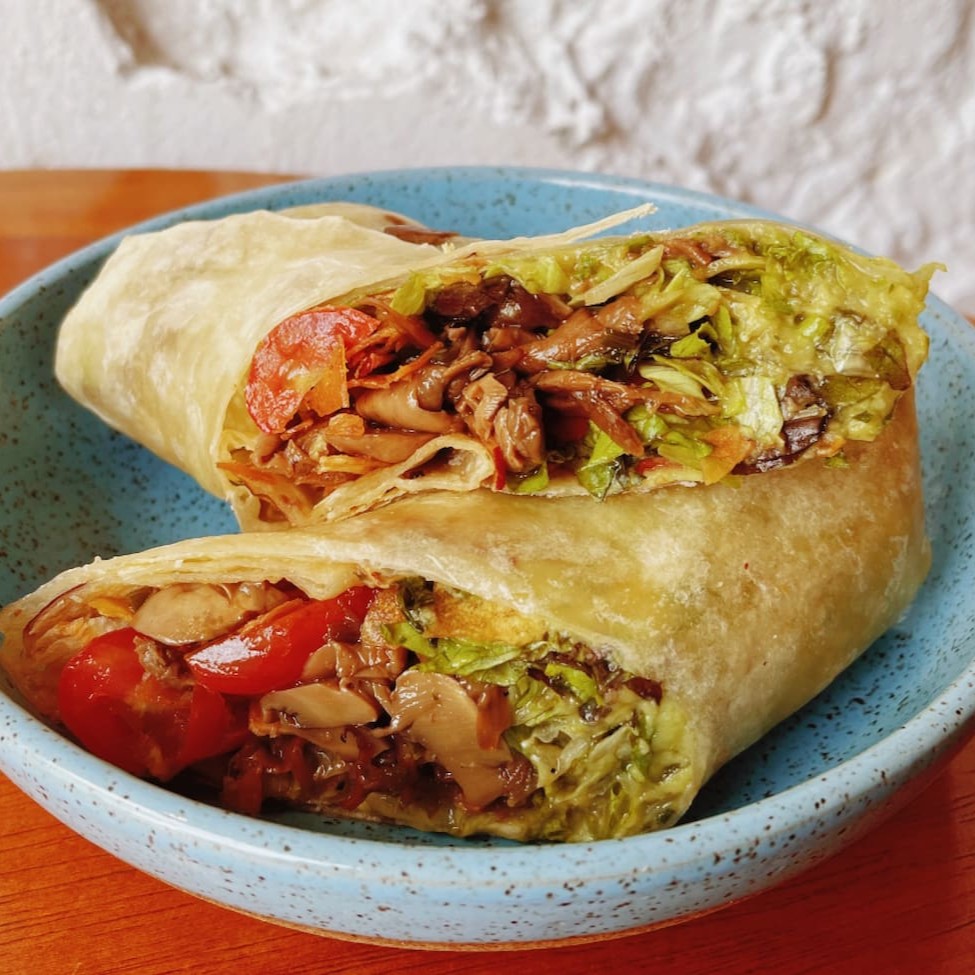 Mix de cogumelos, creme de avocado, tomate cereja, chips de batata doce e mix de folhas, envoltos em wrap tradicional ou de edpinafre (dependendo da disponibilidade do Dia).