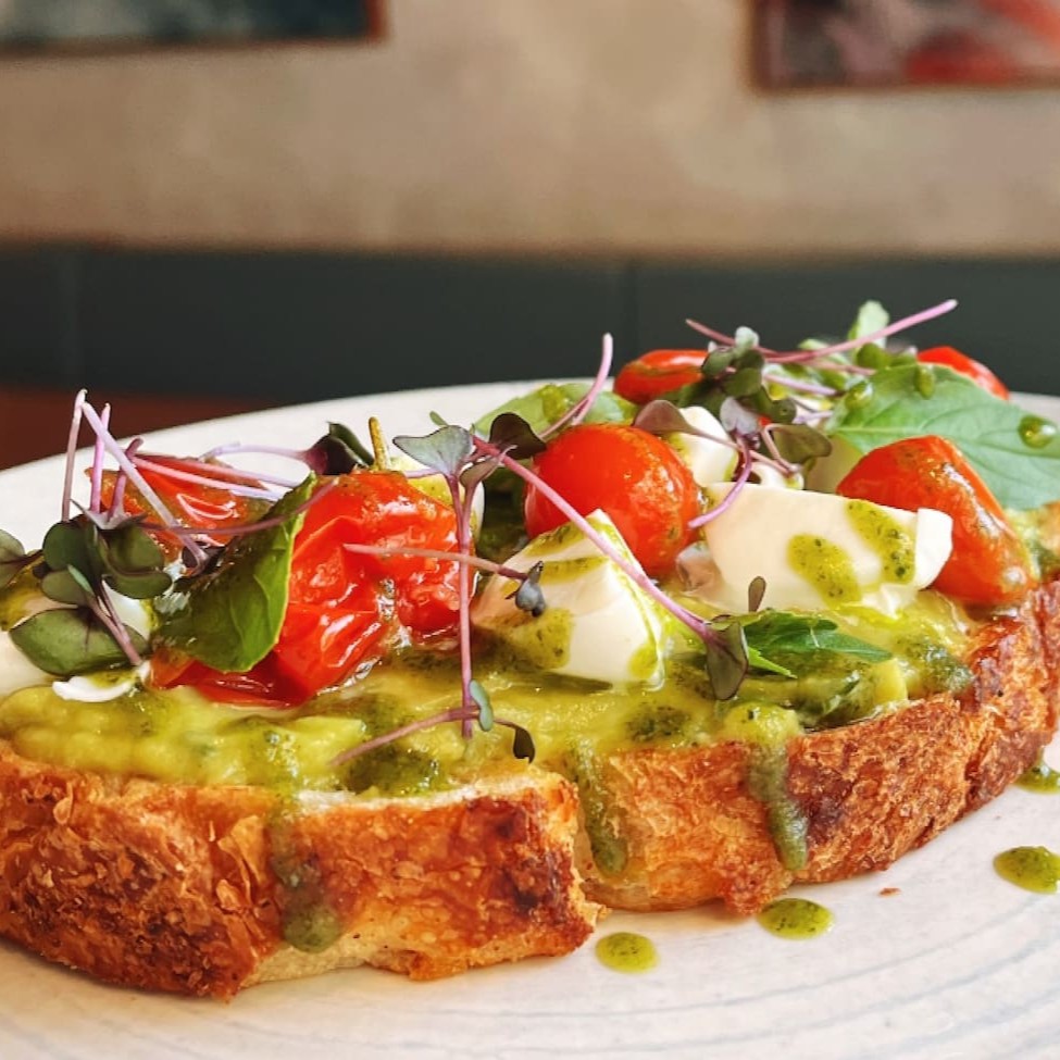 Fatia de pão levain (fermentação natural), creme de avocado, muçarela de búfala, tomate confit, molho pesto e manjericão.