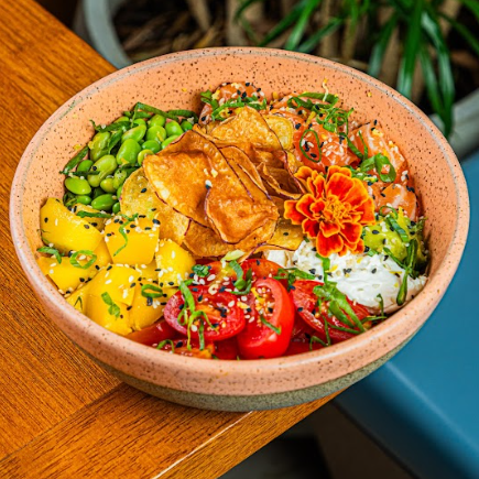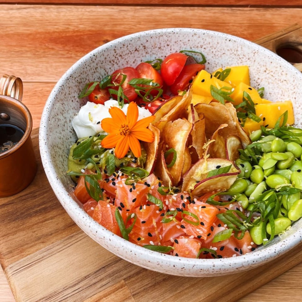 Salmão (crú), creme de avocado, cream cheese, edamame, tomate cereja, manga, chips de batata doce e base de shari (arroz japonês para sushi temperado artesanalmente), finalizado com raspas de limão siciliano, gergelim e cebolinha.