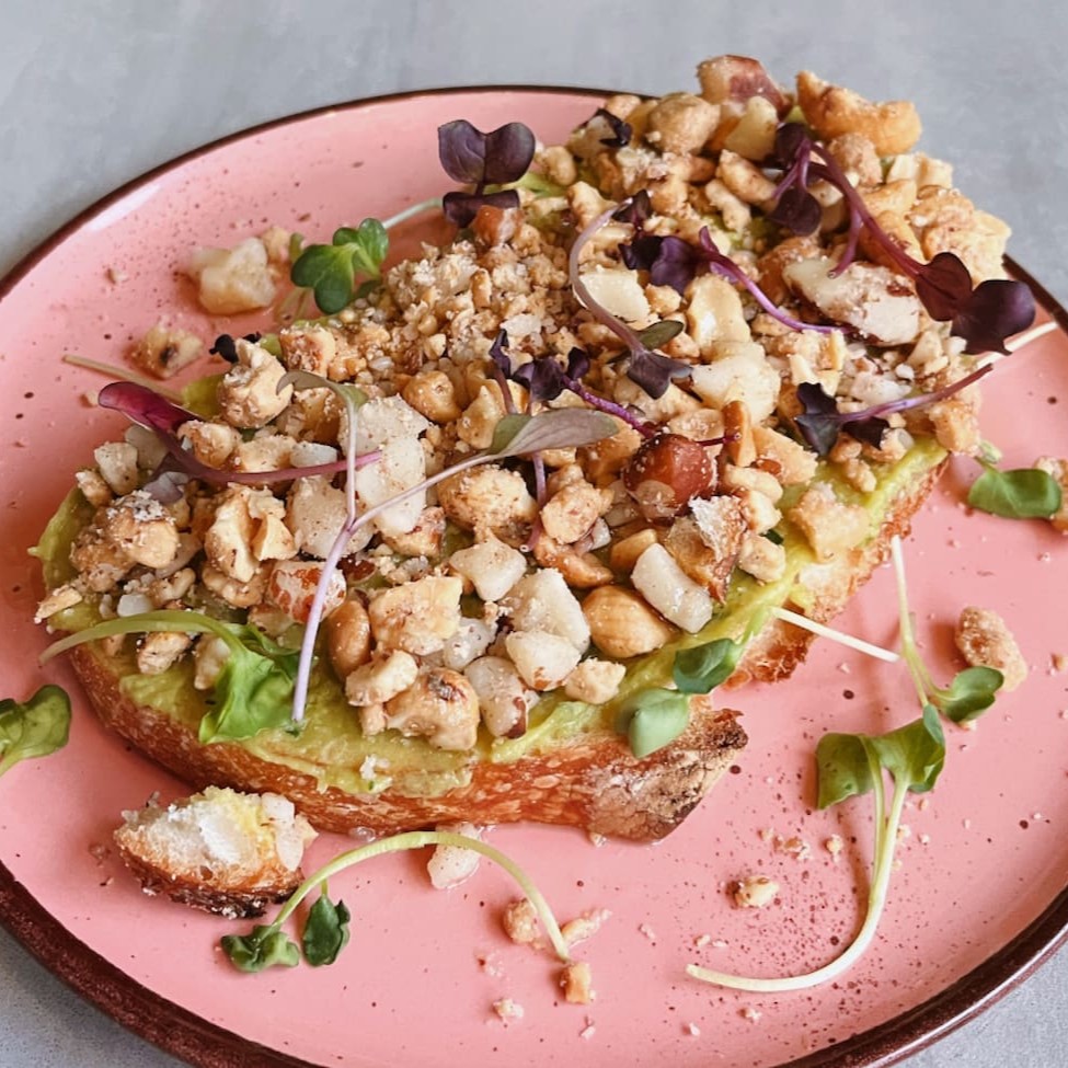 Fatia de pão levain (fermentação natural), creme de avocado e mix de nuts.